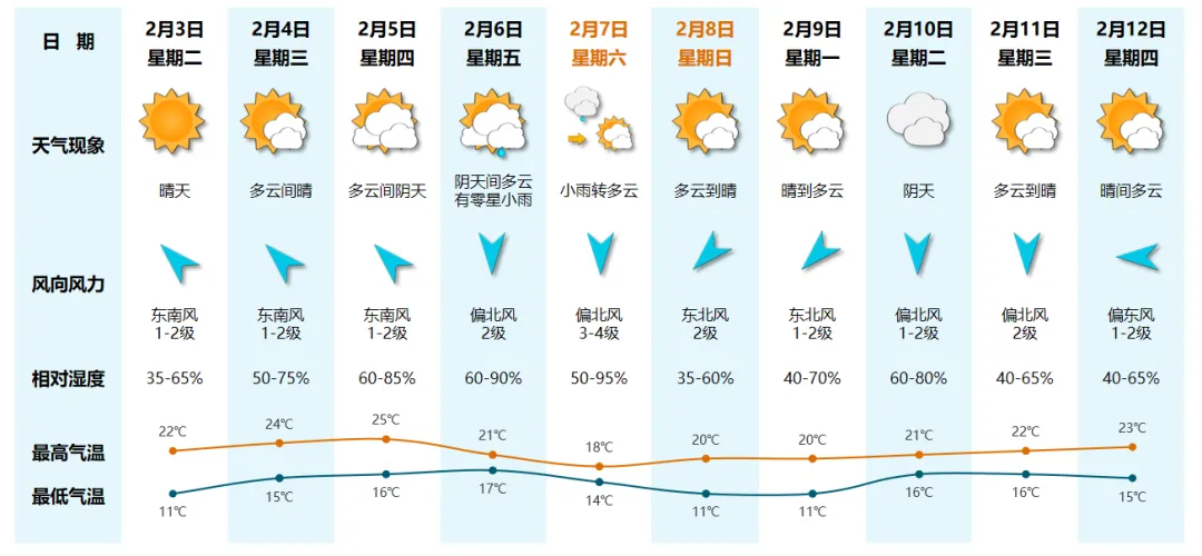 2月3日,好天,11~22℃,相对湿度35%~65%;4日,多云间晴,15~24℃;5日,多云间阴天,16~25℃。(荔湾区惬心台2月2日17时发布)